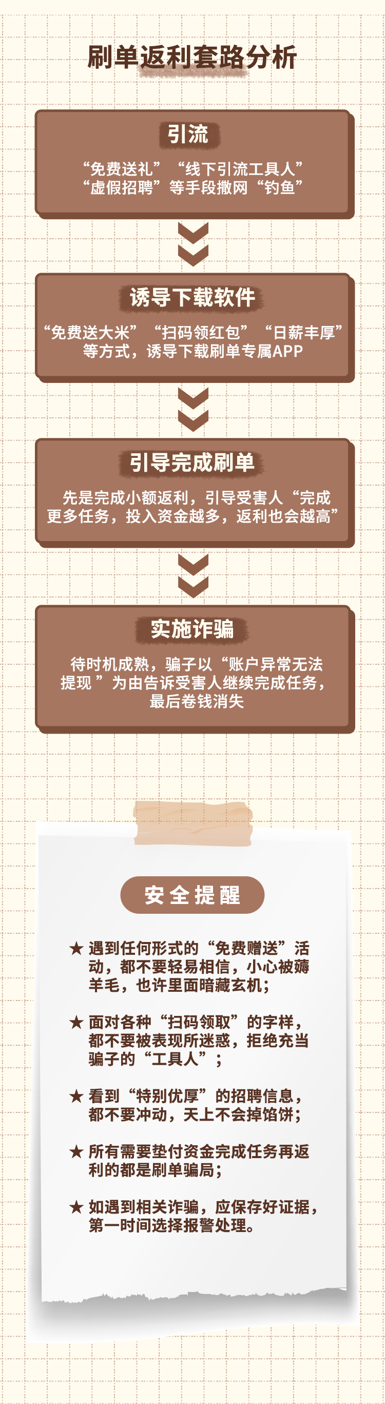 刷单诈骗是我县高发的诈骗类型,足不出户,简单兼职,日入过百,月入过万是刷单诈骗的招牌动作,但随着诈骗手段的不断升级,一个内容多变,集网络交友、购物、赌博、做任务等“局中局”于一体的复合型诈骗让越来越多的人防不胜防。骗子煞费苦心一步步诱惑,受害人心有不甘一步步上当,最终所有钱财被榨干!
