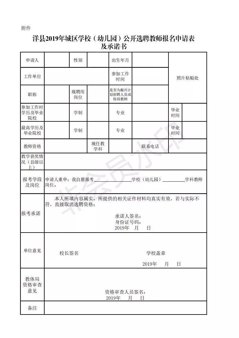 附件:洋县2019年城区学校(幼儿园)公开选聘教师报名申请表及承诺书(原表请在政府网下载或直接打印图片填写)
