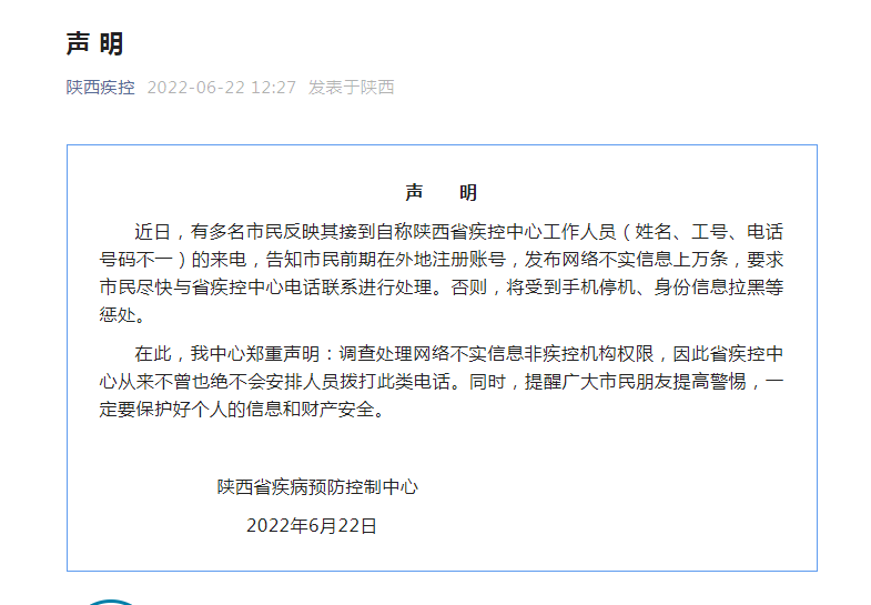 今天(6月22日), 陕西省疾病预防控制中心发布一则声明,提醒广大市民朋友提高警惕,一定要保护好个人的信息和财产安全。以下为声明详情↓↓↓