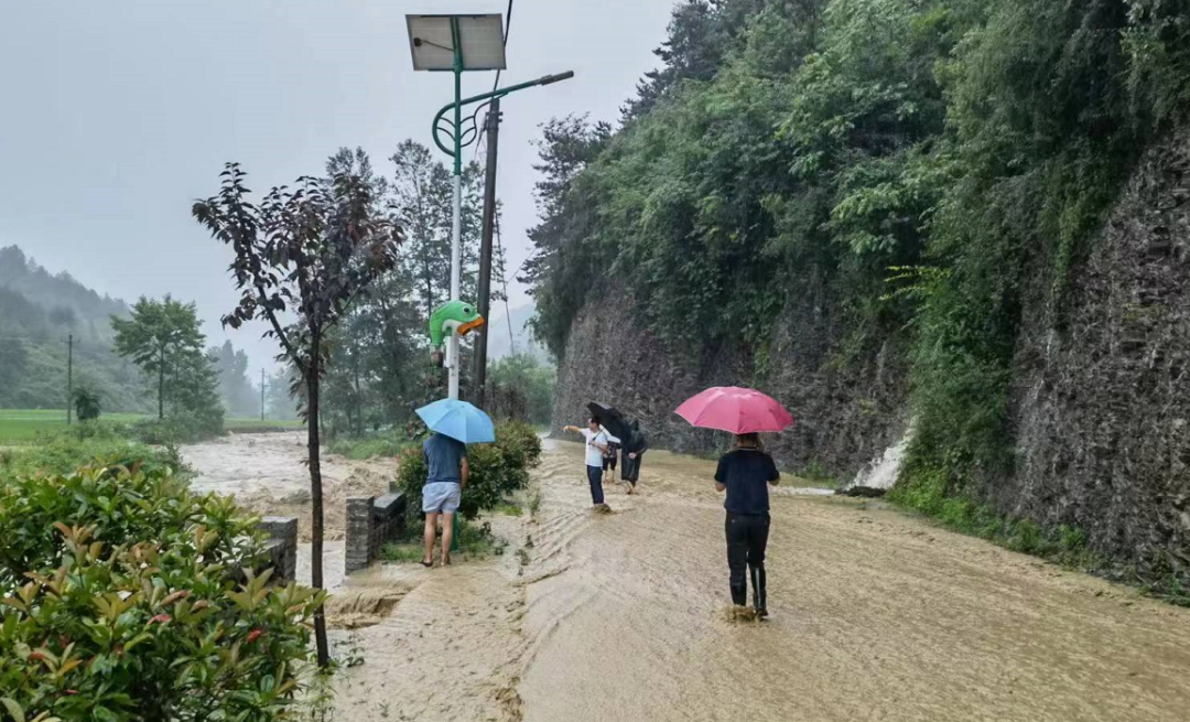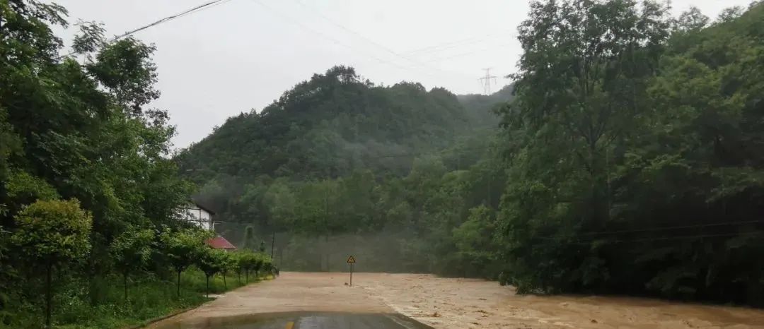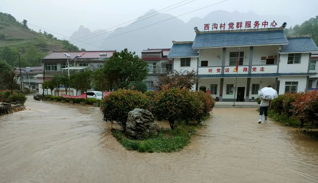 6月22日10时前后,位于蔡山岭山脚下的西沟村遭遇暴雨,洪水漫入村委会门前广场、通村水泥路(马勇 手机拍摄)。