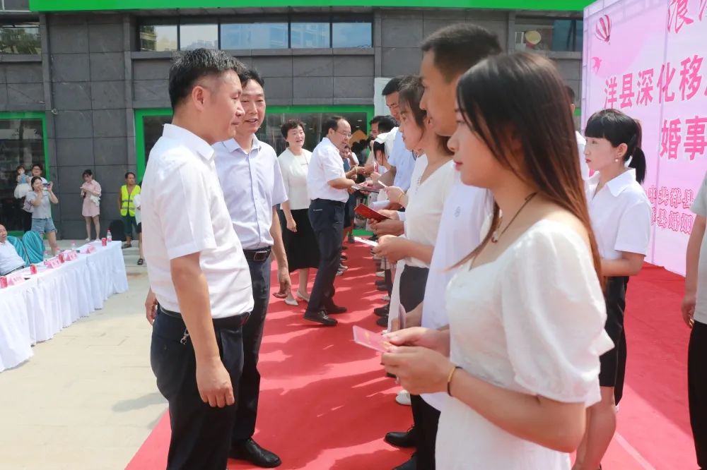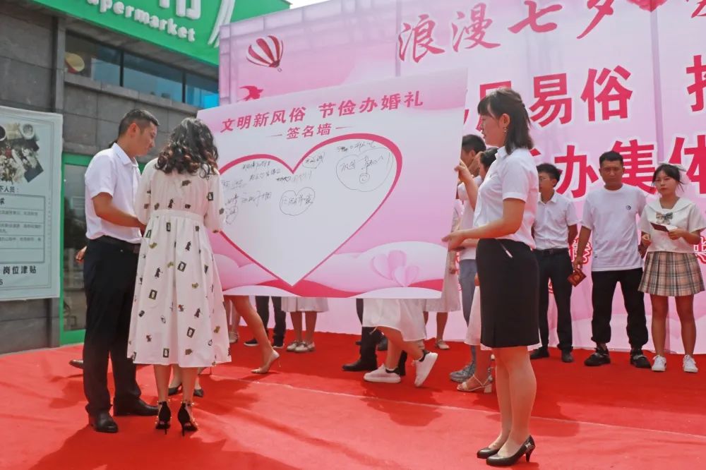 市委宣传部副部长、文明办主任宋瑜,市民政局副局长刘恒,县委常委、宣传部部长陈学宏等6位市县领导给新人颁发了结婚证,新人们在移风易俗、婚事新办签名墙上进行集体签名,共同记录了这个令人难忘的时刻。