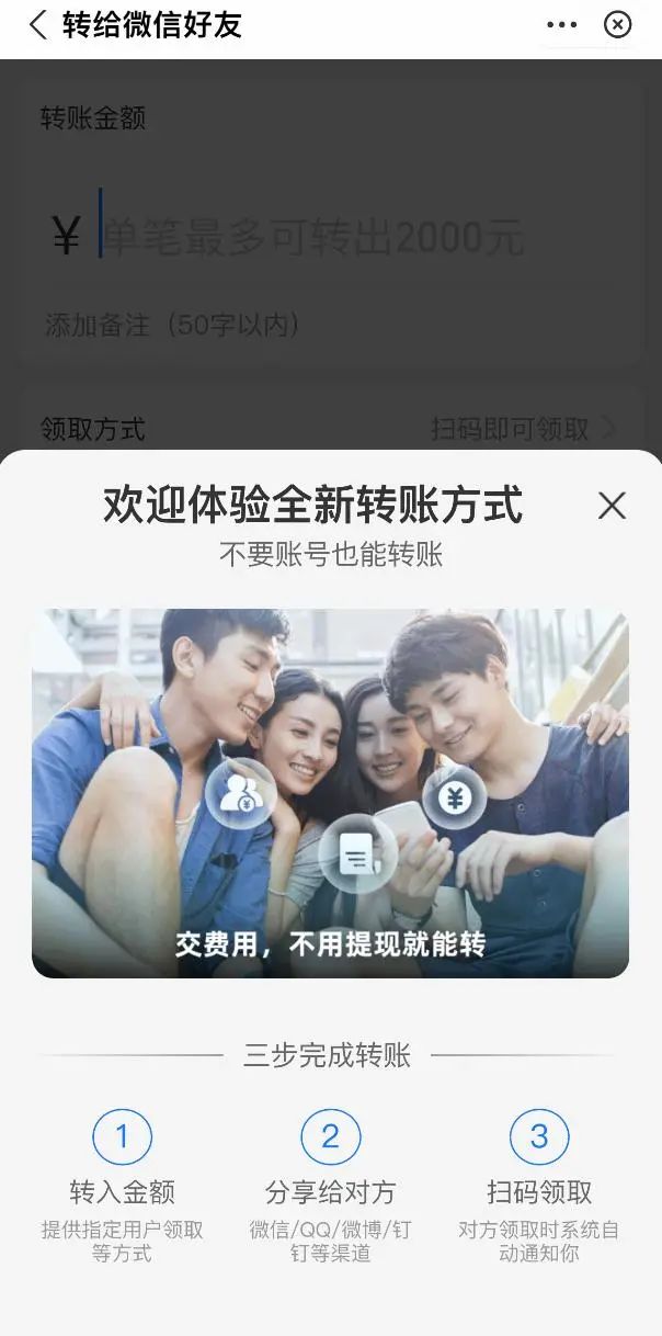 近日,支付宝转账新增“转微信好友”功能,不需要账号,扫描二维码即可领取。单笔最多可转出2000元。