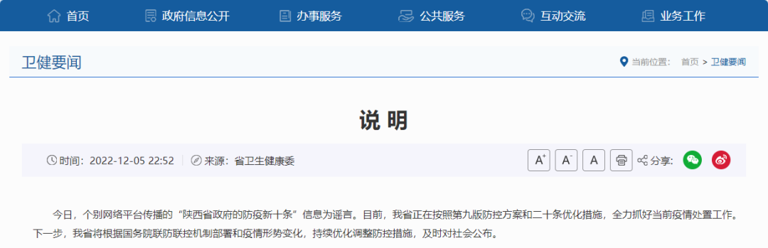 5日晚,陕西省卫健委发布《说明》称,12月5日,个别网络平台传播的“陕西省政府的防疫新十条”信息为谣言。目前,我省正在按照第九版防控方案和二十条优化措施,全力抓好当前疫情处置工作。下一步,我省将根据国务院联防联控机制部署和疫情形势变化,持续优化调整防控措施,及时对社会公布。