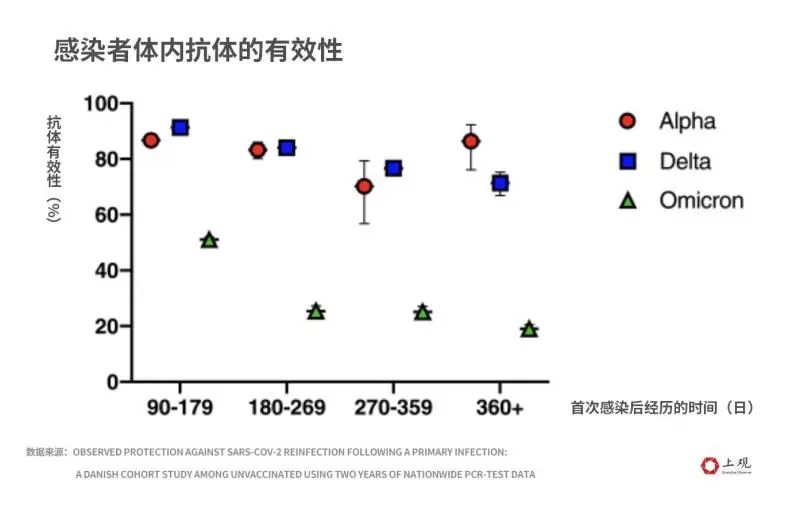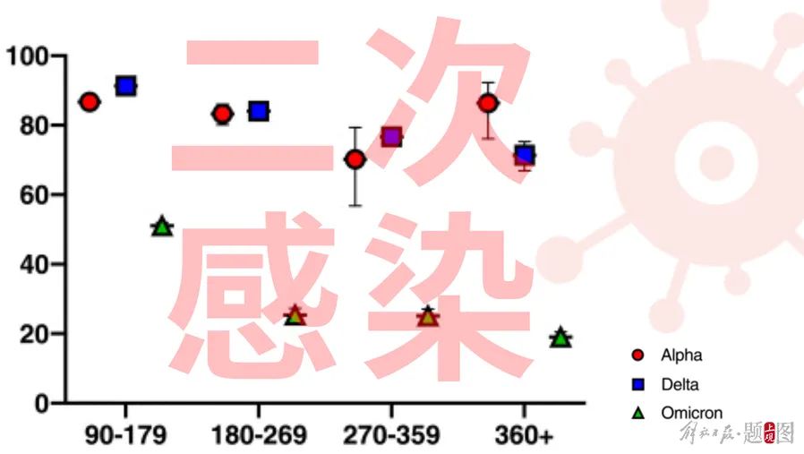 在感染Alpha、德尔塔后的3至5个月,感染者体内抗体的有效性仍分别达到86.6%、91.3%,此后下降幅度有限,最低值依旧在60%以上。