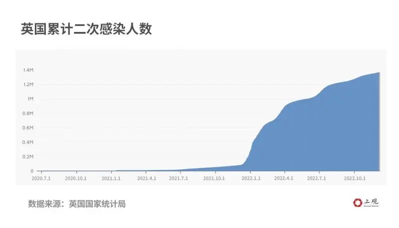 从实际数据上来看,英国在进入奥密克戎阶段前(2022年前),累计二次感染人数并不多,截至2021年12月13日,累计二次感染人数为9.7万人,占当时总感染数的0.1%。