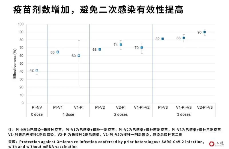 根据5月发表在MedRxiv上的研究论文,相较于未接种疫苗且未感染的患者而言,此前感染过非奥密克戎毒株的患者,体内抗体的有效性为44%;而随着疫苗接种计数的增加,体内抗体的有效性也不断增多,对于已接种三针疫苗且有感染经历的患者而言,抗体的有效性达到83%。