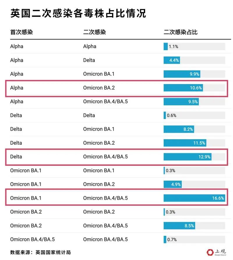 根据英国国家统计局的数据,若感染者首次感染的便是奥密克戎BA.4/BA.5,再次感染这一毒株的人群占比仅为0.7%。