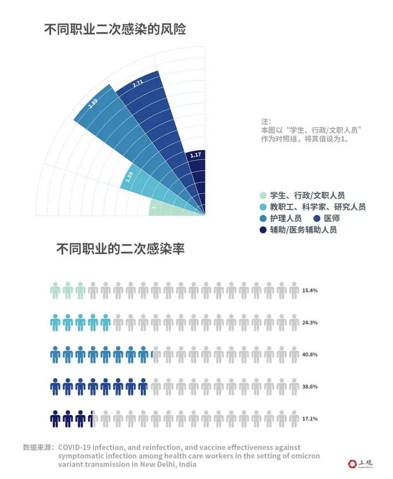 据统计,学生、行政/文职人员的二次感染率为15.4%,与之相比,护理人员的二次感染率最高,占统计人数的40.8%,医师的二次感染率也达38.6%。