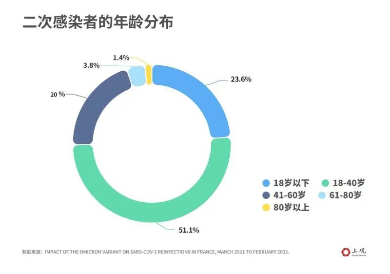 而在二次感染的患者中,18岁至40岁的占比最大,为51.1%,其次是低于18岁、41岁至60岁人员,二次感染的占比分别为23.6%、20%。而老年群体的占比较低,61岁至80岁的占比仅为3.8%,而大于80岁的占比为1.4%。