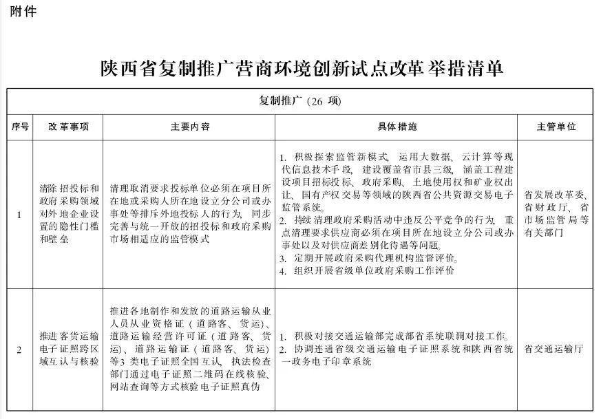 陕西省人民政府办公厅关于印发复制推广营商环境创新试点改革举措的通知各设区市人民政府,省人民政府各工作部门、各直属机构:
